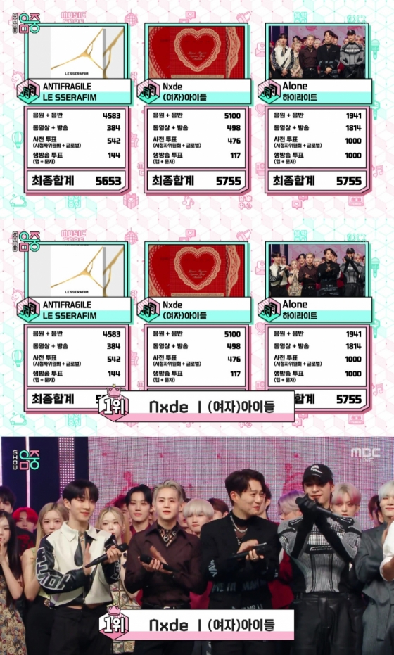 19일 방송된 MBC '쇼! 음악중심'에는 11월 셋째 주 1위 후보가 공개된 가운데 르세라핌 'ANTIFRAGILE', (여자)아이들 'Nxde', 하이라이트 'Alone'이 나란히 이름을 올렸다.