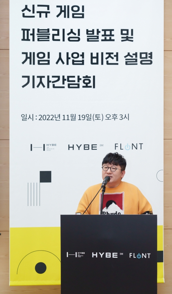 19일 하이브와 하이브IM이 'G-STAR 2022'에서 게임 사업에 대한 의지와 진정성을 공유하는 기자간담회를 개최했다. 부산 벡스코(BEXCO)에서 열린 이날 행사에는 하이브 방시혁 의장과 박지원 CEO, 하이브IM 정우용 대표, 플린트 김영모 대표가 참석했다.