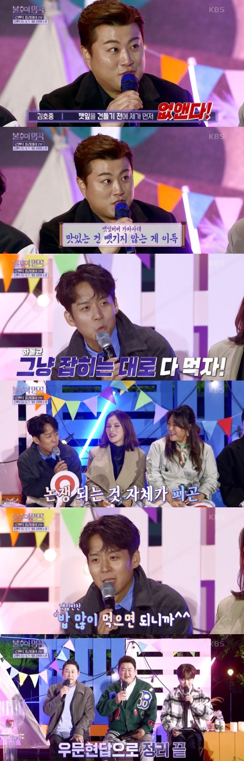 이어 신동엽은 "김호중 씨는 괜찮아요?"라고 물었고, 김호중은 "저는 그분이 깻잎을 건들기 전에 제가 먼저 없앨 것 같다"고 답해 웃음을 자아냈다. 하동균 또한 "저는 굳이 깻잎을 하나씩 안 먹었으면 좋겠다. 그냥 잡혔으면 다 드셨으면 좋겠다. 너무 보기가 불편하다. 밥 많이 먹으면 되니까"라고 답해 좌중을 폭소케 했다. 이에 신동엽은 "일리가 있다"라고 끄덕였다.