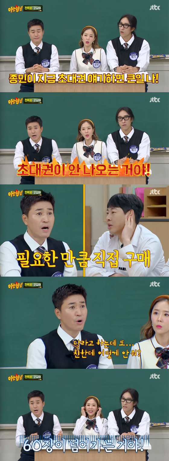 김종민은 이에 "3년 전에는 우리가 주최를 해서 가능했는데 이제는 회사가 주최하는 거라 초대권이 안 나왔다. 사비로 구매해야 했는데 친한 사람들 주다 보니 60장이 넘더라"며 콘서트 출연료 중 절반 가량을 초대권 구매에 썼다고 밝혀 현장을 웃음바다로 만들었다.