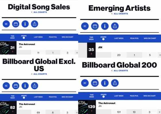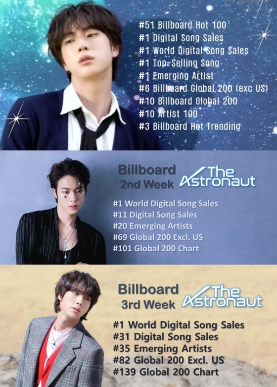 지난 11월 12일자 빌보드 미국 '디지털 송 세일즈' 차트에 1위로 진입한 진의 'The Astronaut'은 19일에 11위, 26일에 31위에 오르며, 3주 연속 차트인을 기록했다. 이는 K팝 솔로 최장 연속 차트인이다.