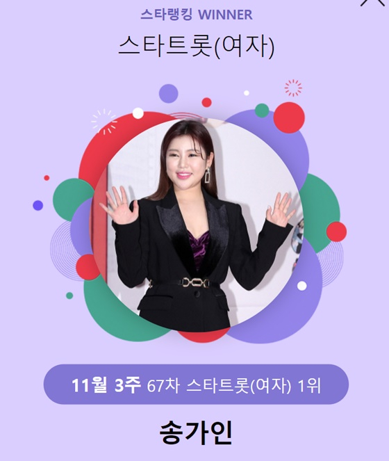 송가인은 11월 17일 오후 3시 1분부터 11월 24일 오후 3시까지 진행된 11월 2주(676차) 스타랭킹 스타트롯 여자 랭킹 투표에서 5만153표로 1위를 차지했다. 이는 67주 연속 1위의 기록이다.