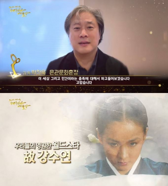 고 강수연의 수상은 동생 강수경 씨가 대리로 수상한 후 "오늘 여기 오면서 1987년에 언니가 옥관상을 받았을 때가 생각났다. 오늘 만약 이 자리에 계셨다면 어땠을까 생각했다"고 말했다. 이어 "저희 언니가 데뷔한 지 올해로 53년 정도 된 것 같다. 그 긴 시간 동안 정말 최선을 다해서 살아온 걸 많은 분들이 인정해 줬다는 걸 언니가 꼭 기억하고 그걸로 위안을 삼고서 정말 좋은 곳에서 편안하게 계셨으면 좋겠다. 배우 강수연을 기억해 주는 모든 분들 진심으로 감사하다"고 전했다.