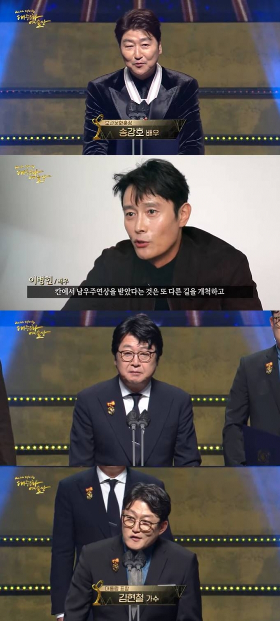 송강호는 "가벼운 마음으로 왔다가 식장에 와서 긴장이 되더라. 평소에 존경하고 늘 흠모하던 예술인 선배님들 동료들이 있는 곳에서 큰 상을 받아서 너무 영광스럽다. 사는 게 편안하고 좋을 때도 있지만 항상 어렵고 힘든 시기가 있는 것 같다. 요즘도 어려움과 힘든 과정 중에 있다고 생각하는데, 연기란 것이 얼마나 큰 위안이 되겠습니까만 위안이 될 수 있는 배우, 그런 연기를 할 수 있도록 끊임없이 노력하는 배우가 되겠다"고 수상 소감을 밝혔다.