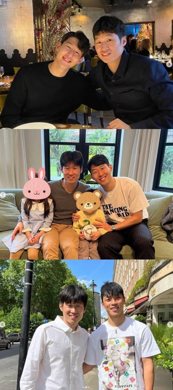 여러 사진 속엔 박지성과 손흥민, 박지성과 황희찬이 따로 만나 어깨동무를 하는 훈훈한 선후배의 모습을 보여줬다. 이 가운데 손흥민은 박지성, 김민지 부부의 집에도 놀러와 두 부부의 아이들과도 화기애애한 시간을 가졌다.