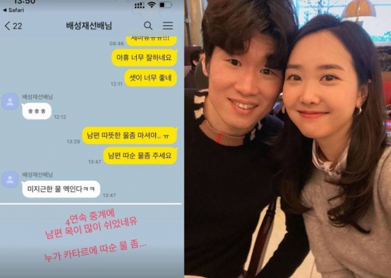 김민지는 메시지를 캡처한 화면 위에 "4연속 중계에 남편 목이 많이 쉬었네요. 누가 카타르에 따순 물 좀"이라고 덧붙이며 박지성의 목 건강을 걱정했다.