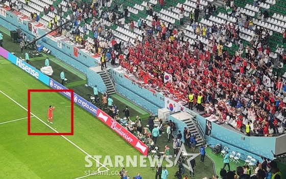 손흥민(빨간색 네모)이 24일 카타르 알라이얀 에듀케이션 시티 스타디움에서 열린 우루과이전을 마친 뒤 혼자서 경기장을 돌며 팬들에게 인사하고 있다. /사진=김명석 기자