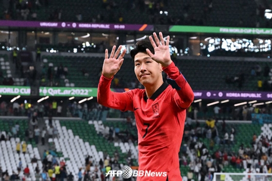 손흥민이 24일 카타르 알라이얀 에듀케이션 시티 스타디움에서 열린 우루과이전을 마친 뒤 경기장을 돌며 팬들에게 인사하고 있다. /AFPBBNews=뉴스1