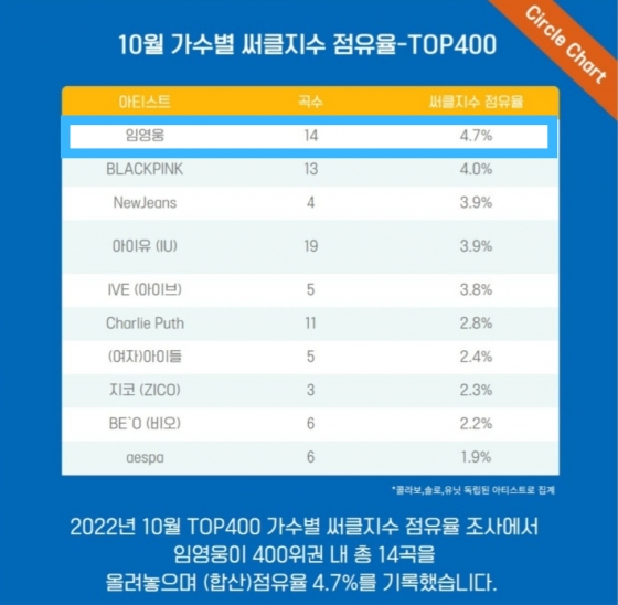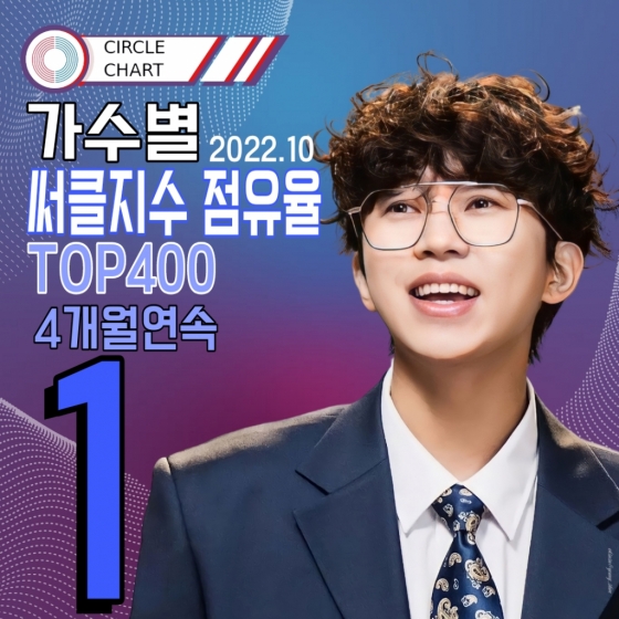 임영웅은 10월 가수별 써클지수 점유율 TOP400에서 4.7%의 점유율을 기록, 1위를 차지했다. 지난 7월부터 4개월 연속 1위 기록이다.