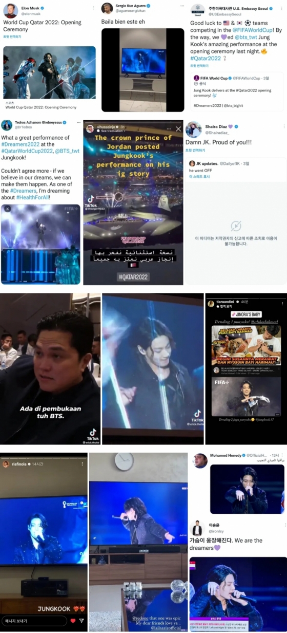 테슬라(Tesla) 창업자 일론 머스크(Elon Musk)는 자신의 트위터에 'World Cup Qatar 2022: Opening Ceremony'라는 글과 함께 정국의 카타르 월드컵 개막식 공연 장면을 공유해 눈길을 끌었다.