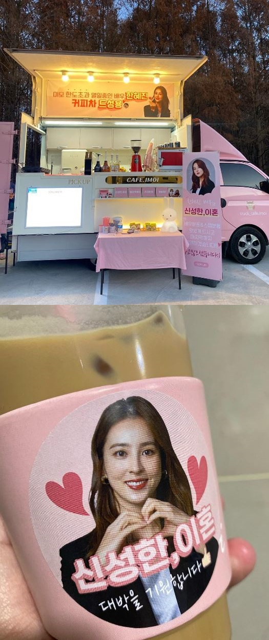 공개된 사진에는 한혜진의 드라마 촬영을 응원하기 위해 기성용이 보낸 커피차가 담겨 있다. 특히 기성용은 '미모 한도초과 열일 중인 한혜진. 커피차 드성용'이라는 센스 있는 문구를 덧붙여 눈길을 끈다.