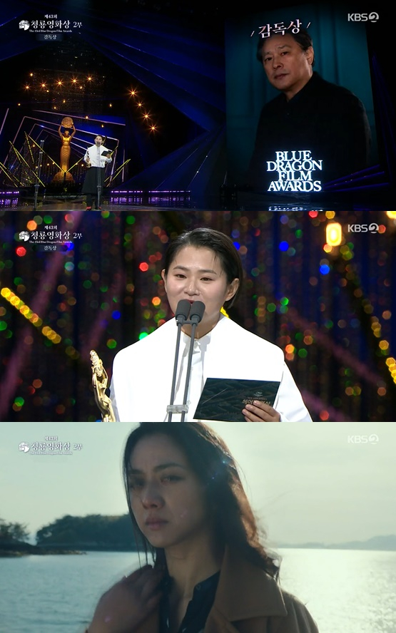이날 박찬욱 감독이 촬영으로 참석하지 못한 가운데, '헤어질 결심'에 출연한 김신영이 무대에 올라 소감을 전했다.
