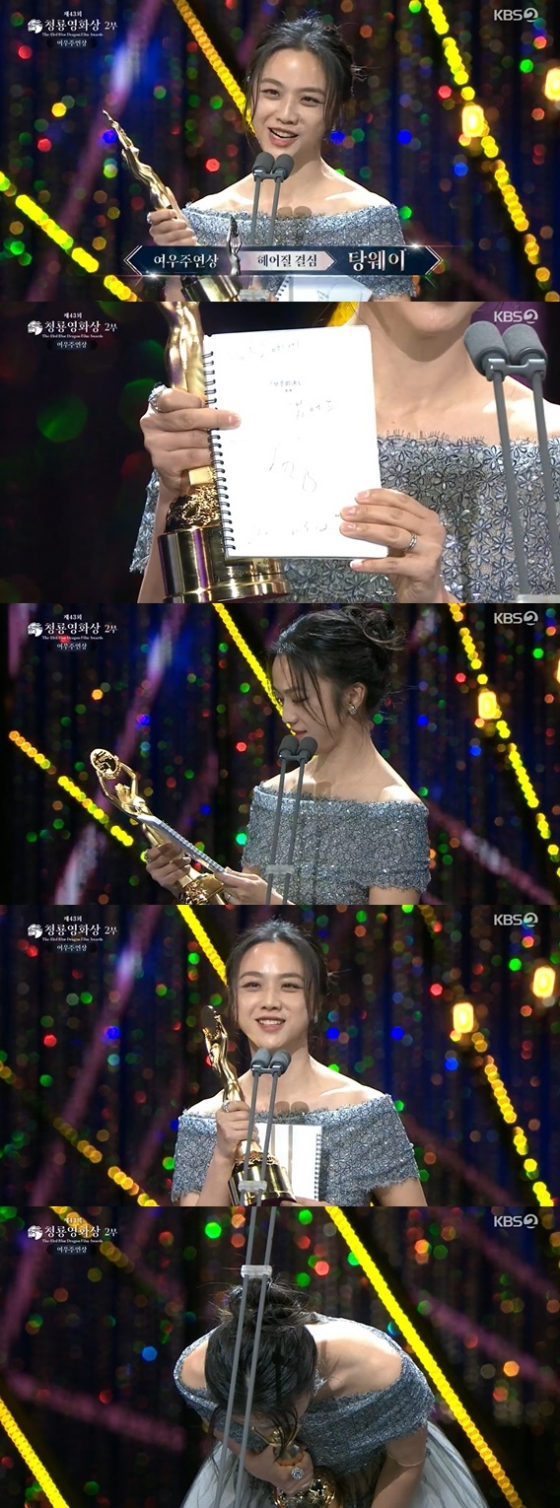 배우 탕웨이가 귀여운 한국말 수상 소감으로 시선을 사로잡았다.