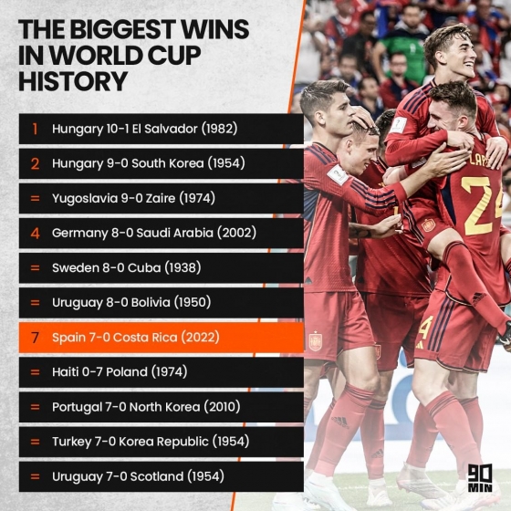 1위는 1982년 헝가리가 엘 살바도르를 상대로 10-1 승리를 거둔 경기였다. 스페인의 코스타리카 7-0 대승은 공동 7위에 올랐다.