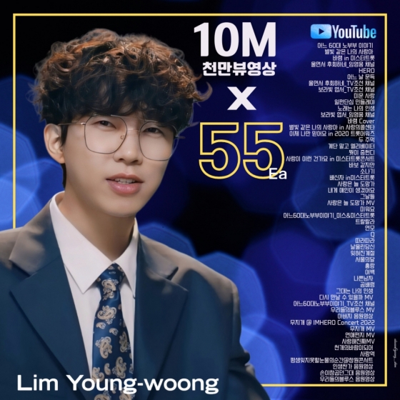 가수 임영웅이 유튜브 천만뷰 영상 55개를 달성하며 인기 고공 행진을 이어갔다.