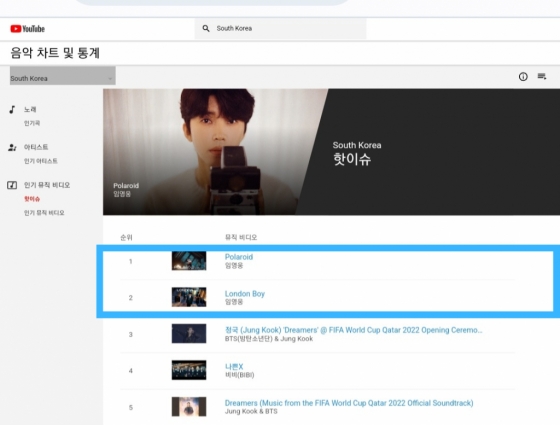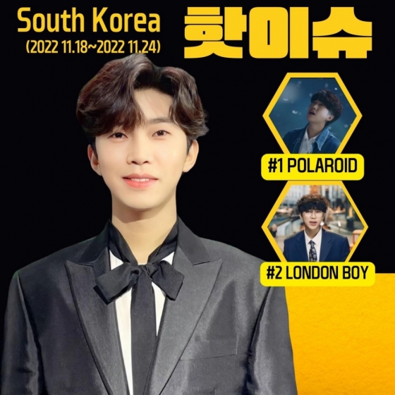 임영웅은 11월 27일 기준, 신곡 'Polaroid'(폴라로이드) 뮤직비디오로 유튜브 한국 핫이슈 차트 1위에 올랐다. 임영웅 첫 자작곡 'London Boy'(런던보이)도 2위에 오르며 막강 인기를 보여줬다.