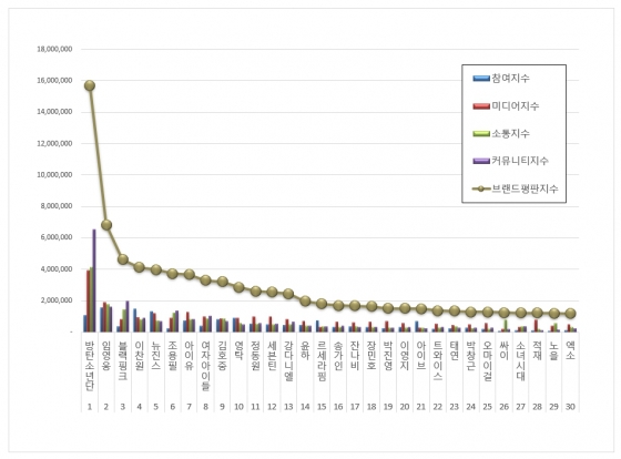 임영웅 브랜드는 참여지수 1,551,996 미디어지수 1,880,250 소통지수 1,782,854 커뮤니티지수 1,622,882가 되면서 브랜드평판지수 6,837,983으로 분석됐다.