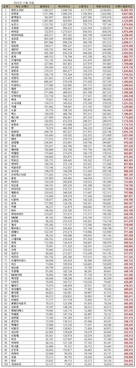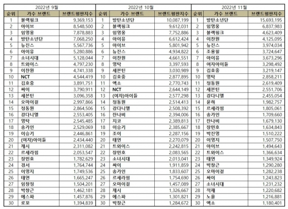 2022년 11월 가수 브랜드평판 30위 순위는 방탄소년단, 임영웅, 블랙핑크, 이찬원, 뉴진스, 조용필, 아이유, 여자아이들, 김호중, 영탁, 정동원, 세븐틴, 강다니엘, 윤하, 르세라핌, 송가인, 잔나비, 장민호, 박진영, 이영지, 아이브, 트와이스, 태연, 박창근, 오마이걸, 싸이, 소녀시대, 적재, 노을, 엑소 순으로 분석됐다.