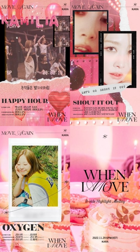 타이틀곡 '웬 아이 무브'(WHEN I MOVE)가 아직 베일에 싸인 가운데, 카라는 앞서 첫 번째 무빙 포스터를 통해 멜로디와 가사 일부를 선공개하기도 했다.