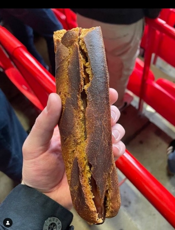 지난 10월 미국 SB네이션은 “맨유 올드트래포드에서 판매 중인 핫도그다. 보기에도 딱딱한 갈색 바게트 소시지가 끼어 있다. 4.8파운드(8천 원) 가격”이라고 경악했다. 나무토막 같다.