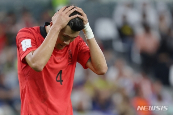 김민재가 24일 대한민국과 우루과이의 경기에서 몸 상태를 체크한 후 머리를 만지고 있다. /사진=뉴시스
