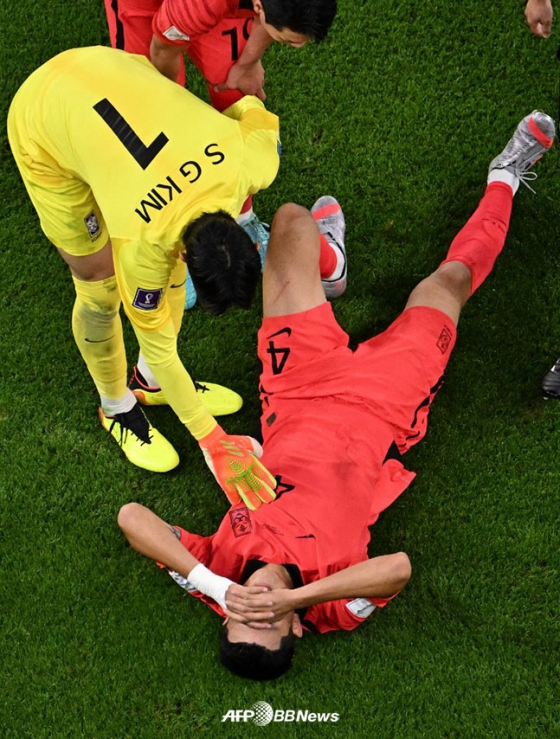 김민재가 지난 24일 우루과이전에서 부상으로 쓰러진 뒤 그라운드에 누워 고통을 호소하고 있다. /AFPBBNews=뉴스1