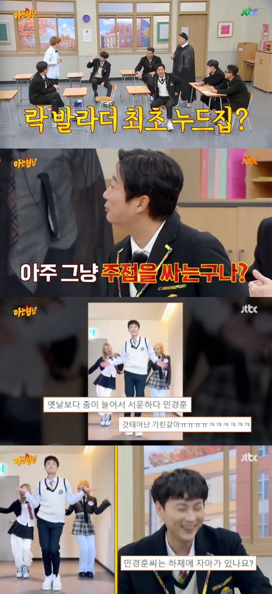 하지만 이는 민경훈이 최근 (여자)아이들의 신곡 '누드(Nxde)'의 댄스 챌린지를 함께 했다는 소식이었다. 이 영상을 접한 서장훈은 "하체는 왜 그렇게 왔다갔다 하는 거냐"고, 김희철은 "거의 숭구리당당이다"고 말해 현장을 웃음바다로 만들었다.