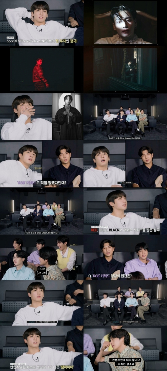 정국은 "RGB가 보통 블루 그레이 레드잖아요. 근데 이건 블랙 그레이 레드로 콘셉트를 잡았다"라고 자신만이 재탄생 시킨 새로운 RGB 키워드에 대해 구체적이게 설명했다. 정국의 대답에 멤버들은 "괜찮은데? 오 ~JK"라고 칭찬을 쏟아냈다.