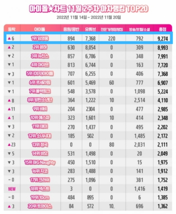 임영웅은 11월 26일 발표된 아이돌차트 11월 2주차(22.11.14~22.11.20) 아차랭킹에서 음원점수 894점, 유튜브 점수 7368점, 소셜점수 792점 등 총점 9274점으로 1위를 기록했다.