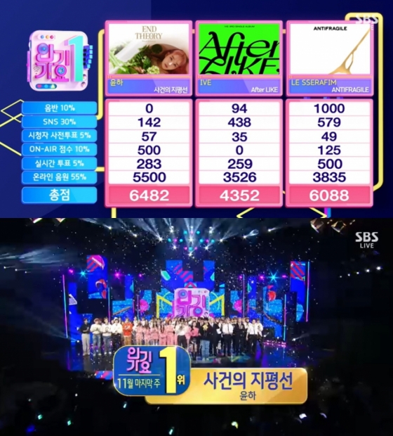 27일 방송된 SBS 음악프로그램 '인기가요'에서는 금주의 1위를 발표했다. 이날 1위 후보로는 윤하의 '사건의 지평선', 아이브의 '애프터 라이크', 르세라핌의 '안티프레자일'이었다.