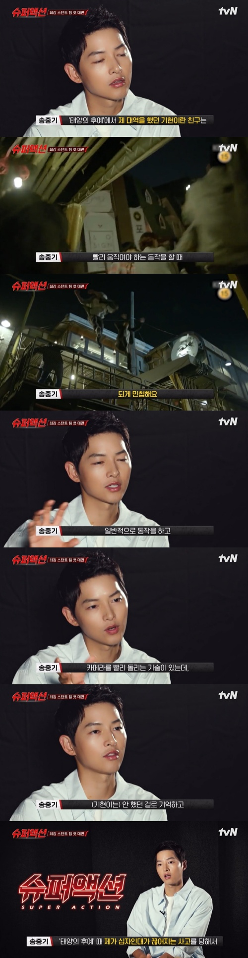 이날 첫방송한 '슈퍼액션'은 세계 최초 스턴트 팀 서바이벌이다. 9스턴트 팀 소개에 송중기가 등장했다.