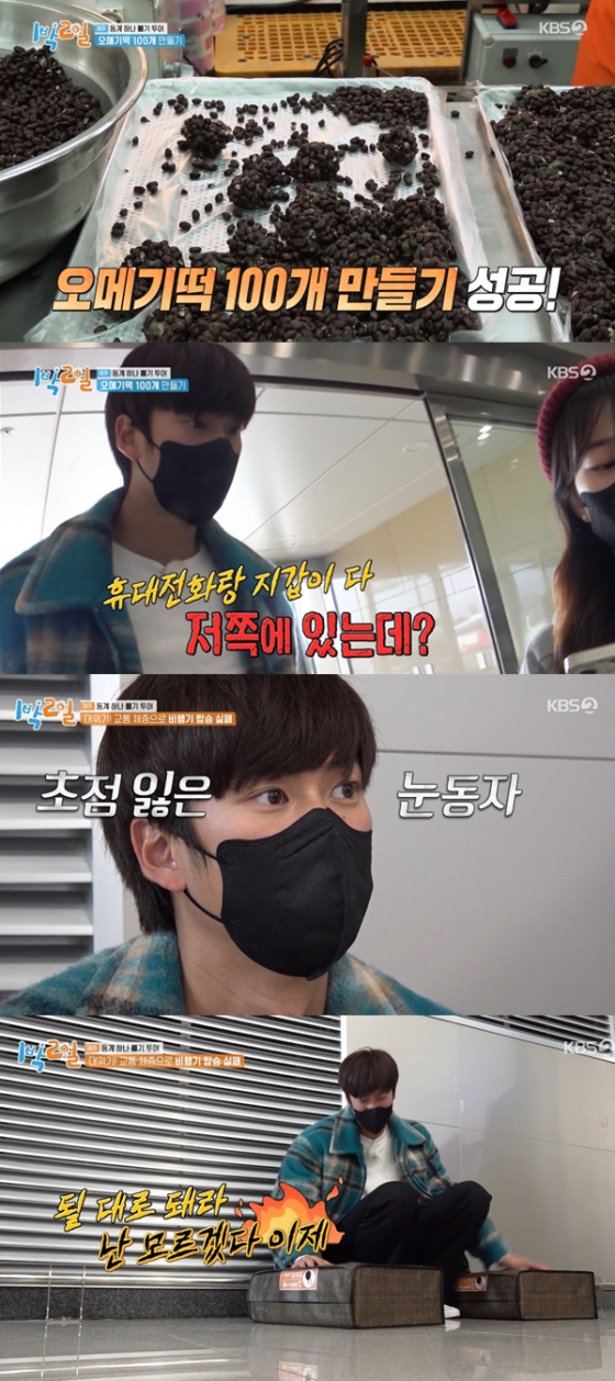 이날 나인우는 멤버들과 따로 오프닝 진행 후 약 5시간 만에 제주도에 홀로 도착했다. 그러나 도착하자마자 제작진으로부터 1시간 내에 오메기떡 100개 만들기 미션을 받게 됐다. 해당 미션을 제 시간 안에 성공해야만 1시간 뒤 수속하는 비행기를 탑승하여 멤버들이 있는 곳으로 돌아갈 수 있었다.