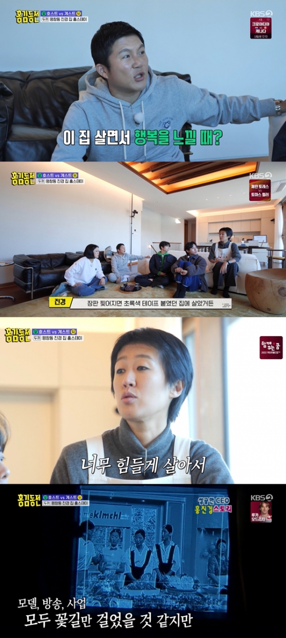 집을 둘러본 후 조세호는 홍진경에게 "이런 집에 살면서 행복을 느낄 때가 언제냐"라고 물었고, 홍진경은 "항상 감사하다. 어렸을 때 이런 집에 사는게 꿈이었다. 장판 찢어지면 초록색 테이프 붙일 정도로 너무 힘들게 살았다"라고 답했다. 그리고 "당시 2층 집에 사는 경제적으로 좋은 친구가 있었다. 그 집에 한 번 다녀오고 난 후부터 우리 집이 얼마나 가난한지 알게 됐다. 그 전까지는 비교대상이 없어서 몰랐다. 그 이후로 전망 좋은 집이 로망이 됐다"라고 동기부여가 되었던 사건에 대해서도 덧붙였다. 그러나 김숙은 진지한 분위기를 깨고 홍진경에게 "그런데 혹시 이 집 빌린 거 아니지?"라고 해 모두를 폭소케했다.