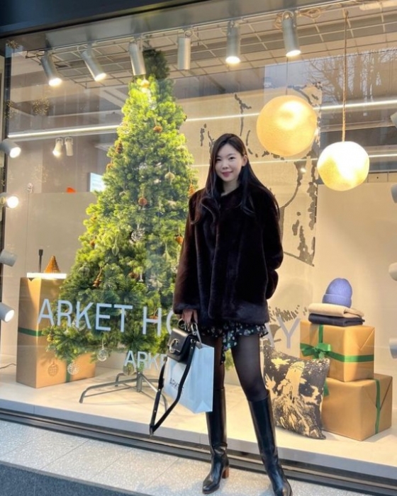 사진에서 이다은은 각선미가 돋보이는 미니스커트를 입고 고급스러운 아우터를 걸친 채로 포즈를 취하고 있다.