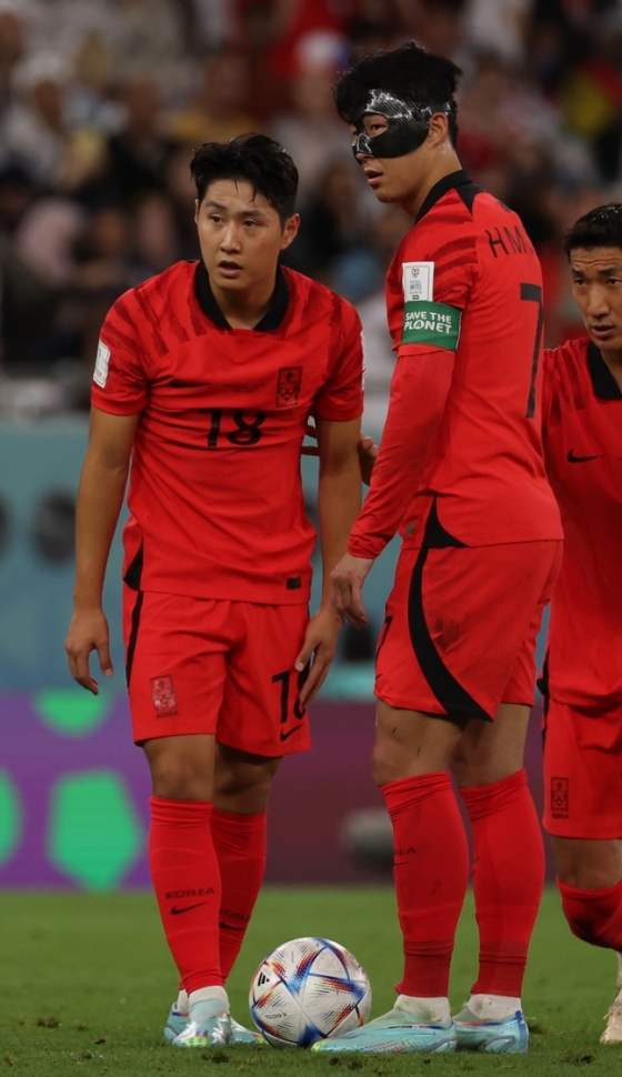 28일(현지시간) 카타르 알라이얀 에듀케이션 시티 스타디움에서 열린 2022 카타르 월드컵 H조 2차전 대한민국과 가나의 경기, 이강인과 손흥민이 프리킥 준비를 하고 있다. /사진=뉴시스