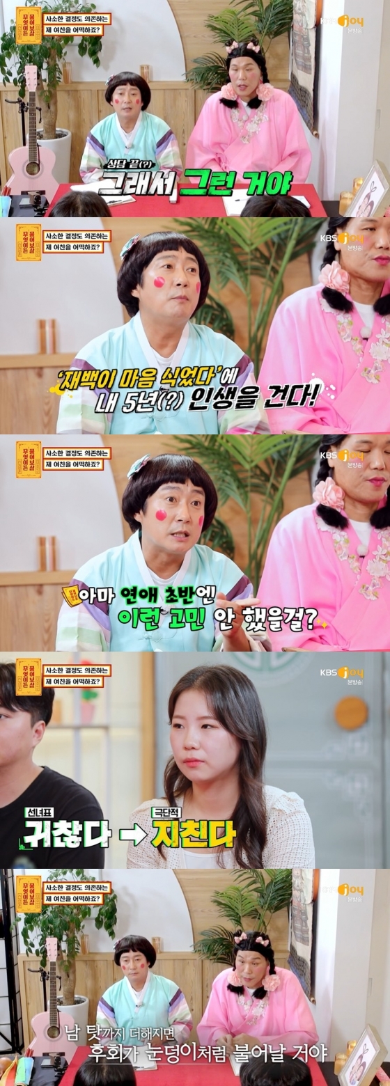이날 23살 여자친구가 사소한 일도 의견을 묻는다고 고민한 의뢰인은 "제가 뭔가 다른 일을 하고 있을 때, 바쁠 때는 시간 낭비일 수도 있다고 생각한다. 사소한 의견 정도는 여자친구가 알아서 해줬으면 좋겠다고 생각한다"라고 털어놨다.