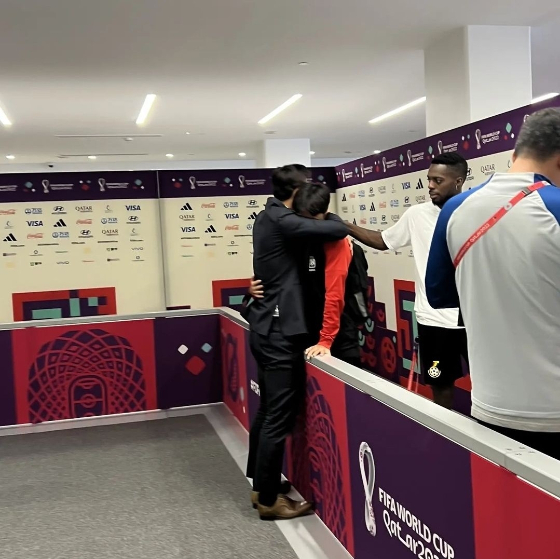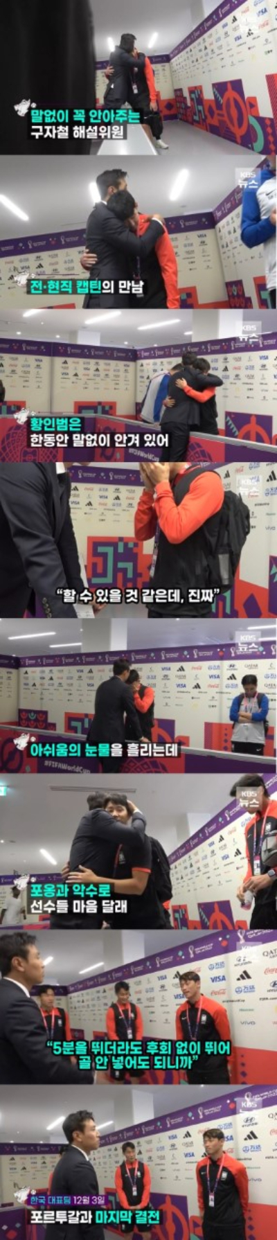 구자철 해설위원은 지난 28일 가나에 2대3으로 아쉽게 패한 대표팀 후배들을 만나기 위해 경기 종료 후 선수들이 나오는 믹스드존을 찾았다. 가나전이 끝난 뒤 굳은 표정으로 고개를 숙이고 있던 '캡틴' 손흥민은 구자철 위원을 보고 잠시 눈빛이 흔들리는 모습을 보였고, 구자철 위원은 손흥민을 말없이 꼭 안아주며 토닥였다. 함께 두 번의 월드컵을 뛰었던 경험과 주장 완장의 무게를 공유하고 있는 두 사람은 별 말을 나누지 않았지만, 안아주는 것만으로도 진한 위로의 마음이 묻어났다.