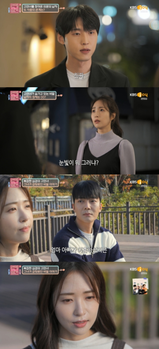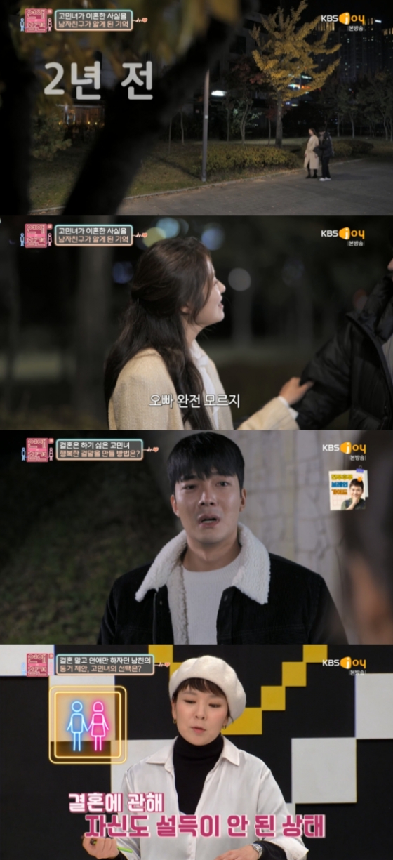 29일 오후 방송된 KBS Joy 예능프로그램 '연애의 참견3'에서 고민녀가 남자친구에 이혼한 사실을 숨겼다.