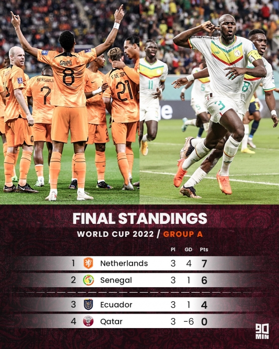 개최국 카타르가 속한 A조의 생존자는 네덜란드와 세네갈이었다. 네덜란드는 승점 7점으로 조 1위, 세네갈이 승점 6점으로 조 2위가 됐다. 에콰도르는 승점 4점에 머물며 3위, 카타르는 3패 승점 0점으로 4위로 대회를 마쳤다.