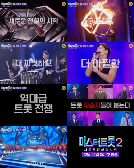 TV CHOSUN 트롯 오디션 '미스터트롯2'가 12월 22일 밤 10시 첫 방송을 공식 발표하며 안방을 정조준하고 있는 가운데, 새 티저 영상을 통해 이번 시즌 참가자들의 모습이 최초로 공개돼 폭발적인 반응이 쏟아졌다.