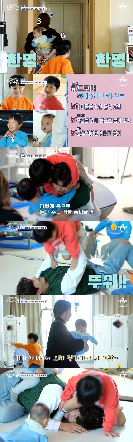 30일 방송된 채널A 예능프로그램 '요즘 남자 라이프-신랑수업'(이하 '신랑수업')에는 '다둥이 맘' 정주리가 하드코어 육아에 손호영을 초대했다.