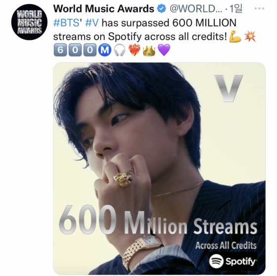 11월 27일 뷔의 스포티파이 개인 페이지에 수록된 드라마 OST 3곡과 인스트루멘털(Instrumental)이 6억 스트리밍을 돌파, 믿고 듣는 'OST 킹' 존재감을 빛냈다.
