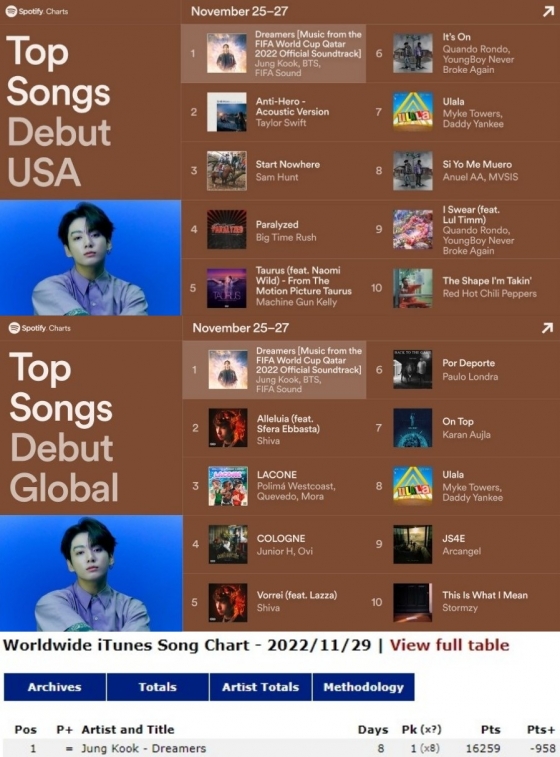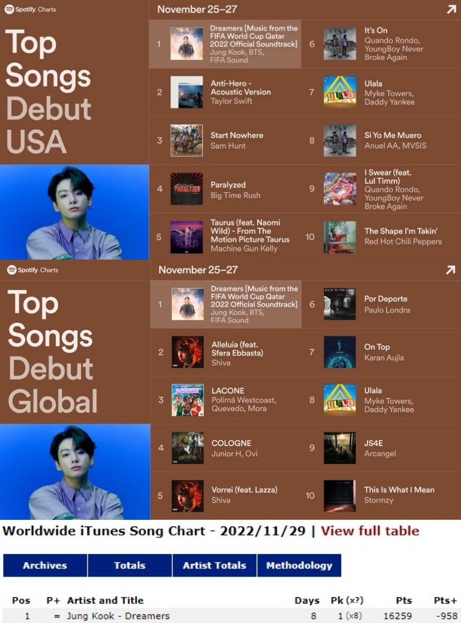 정국이 2022 카타르 월드컵 개막식 무대에서 선보여 글로벌 화제를 모았던 'Dreamers'는 세계 최대 음원 플랫폼 스포티파이 최신 차트(11월 25일~27일 자)에서 톱 송 데뷔 글로벌 차트 1위를 차지했다.
