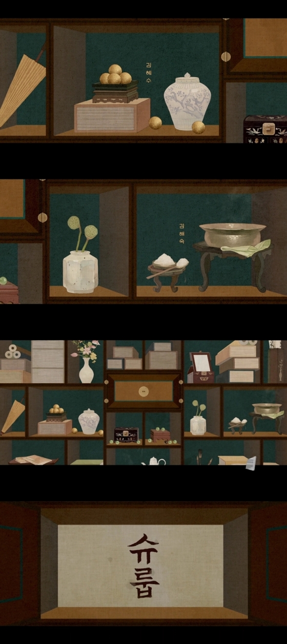 '슈룹' 오프닝 영상은 고풍스러운 장식장 안에 갖가지 물건들이 정성스럽게 놓인 모습으로 눈길을 끈다. 이어 김혜수(화령 역), 김해숙(대비 역), 최원영(이호 역) 등 드라마 주역들의 이름이 등장한다.