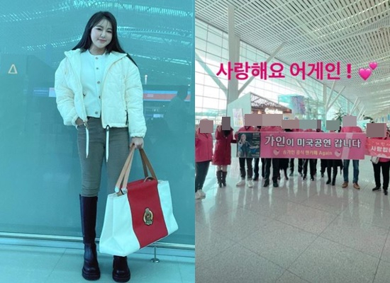 송가인이 공개한 사진에는 이날 출국하는 자신을 응원하러 공항을 찾은 어게인(팬클럽 명)의 모습이 담겨 있다. 이들은 송가인을 응원하는 현수막, 플래카드 등을 들고 송가인에 대한 애정을 드러냈다.