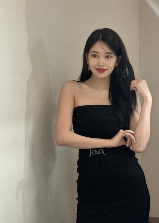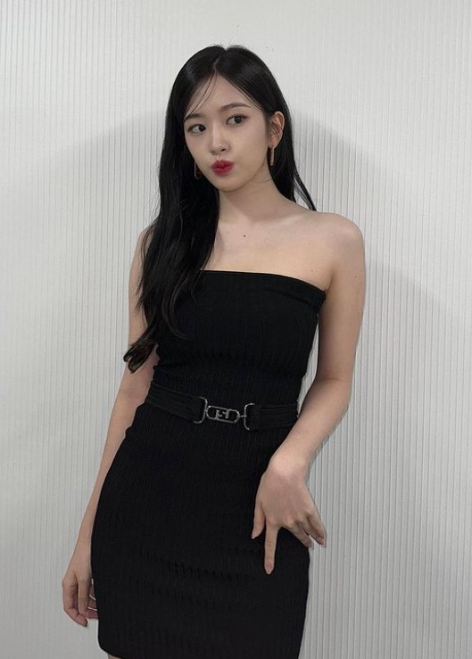 공개된 사진 속에는 안유진이 아찔한 몸매를 드러낸 미니 드레스를 입고 카메라를 응시하는 모습이 담겼다.