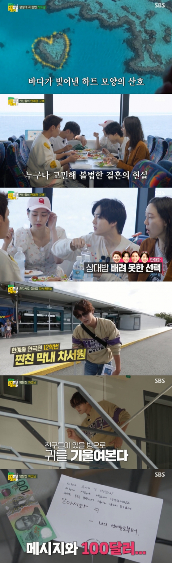 1일 오후 방송된 SBS 예능프로그램 '찐친 이상 출발-딱 한 번 간다면'(이하 '딱 한 번 간다면')에서는 멤버들이 호주 여행 4일 차를 맞아 '에얼리비치'로 떠나는 모습이 그려졌다. 후발 주자로 출발한 차서원은 약 20시간의 긴 비행 끝에 드디어 호주에 도착해 찐친들을 만나러 간다.