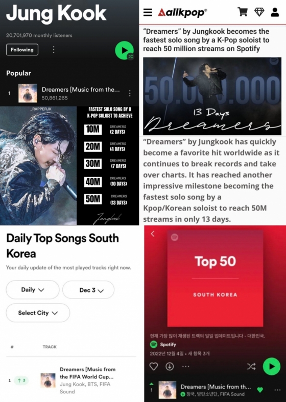지난 11월 20일 발매된 정국의 2022 FIFA 카타르 월드컵 공식 사운드 트랙 'Dreamers'는 최근 세계 최대 음원 플랫폼 스포티파이에서 5000만 스트리밍을 돌파했다.