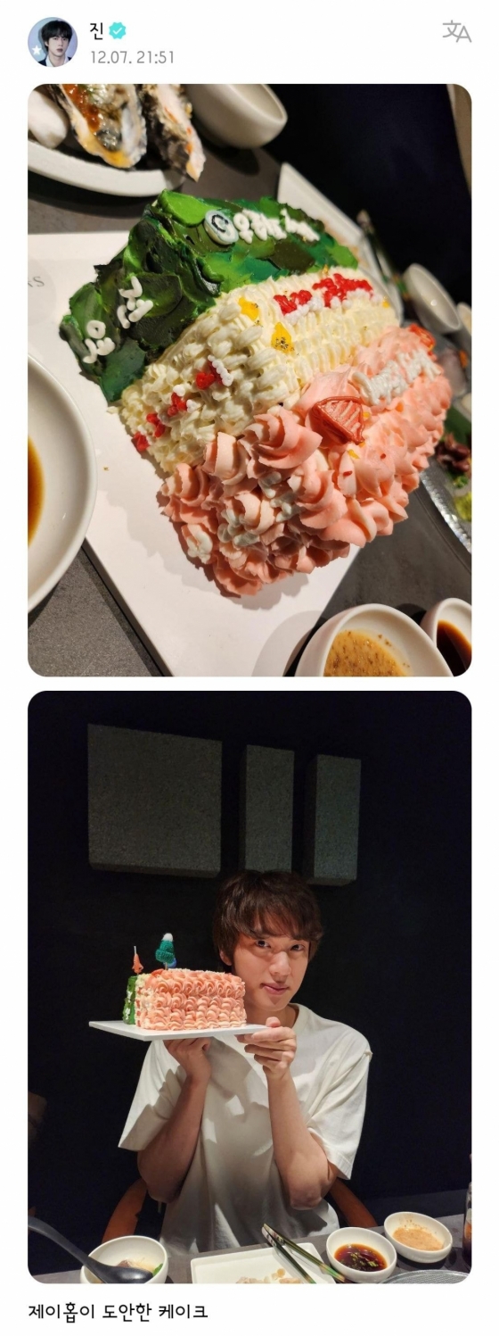 진은 12월 7일 팬 커뮤니티 플랫폼 위버스(weverse)에 '제이홉이 도안한 케이크'라는 글과 함께 사진을 게재했다.