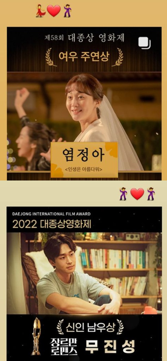 류승룡은 지난 9일 자신의 공식계정에 '인생은 아름다워'로 대종상 여우주연상을 수상한 염정아와 '장르만 로맨스'로 신인상을 수상한 무진성에게 축하를 건넸다.